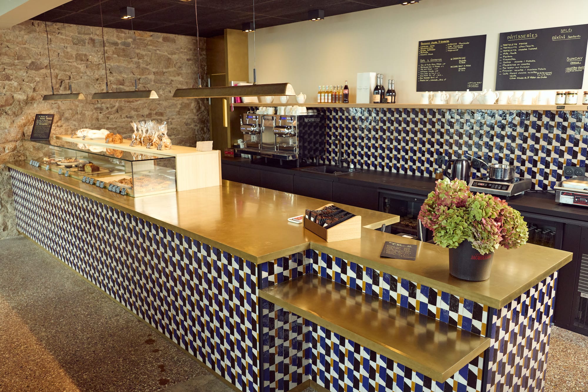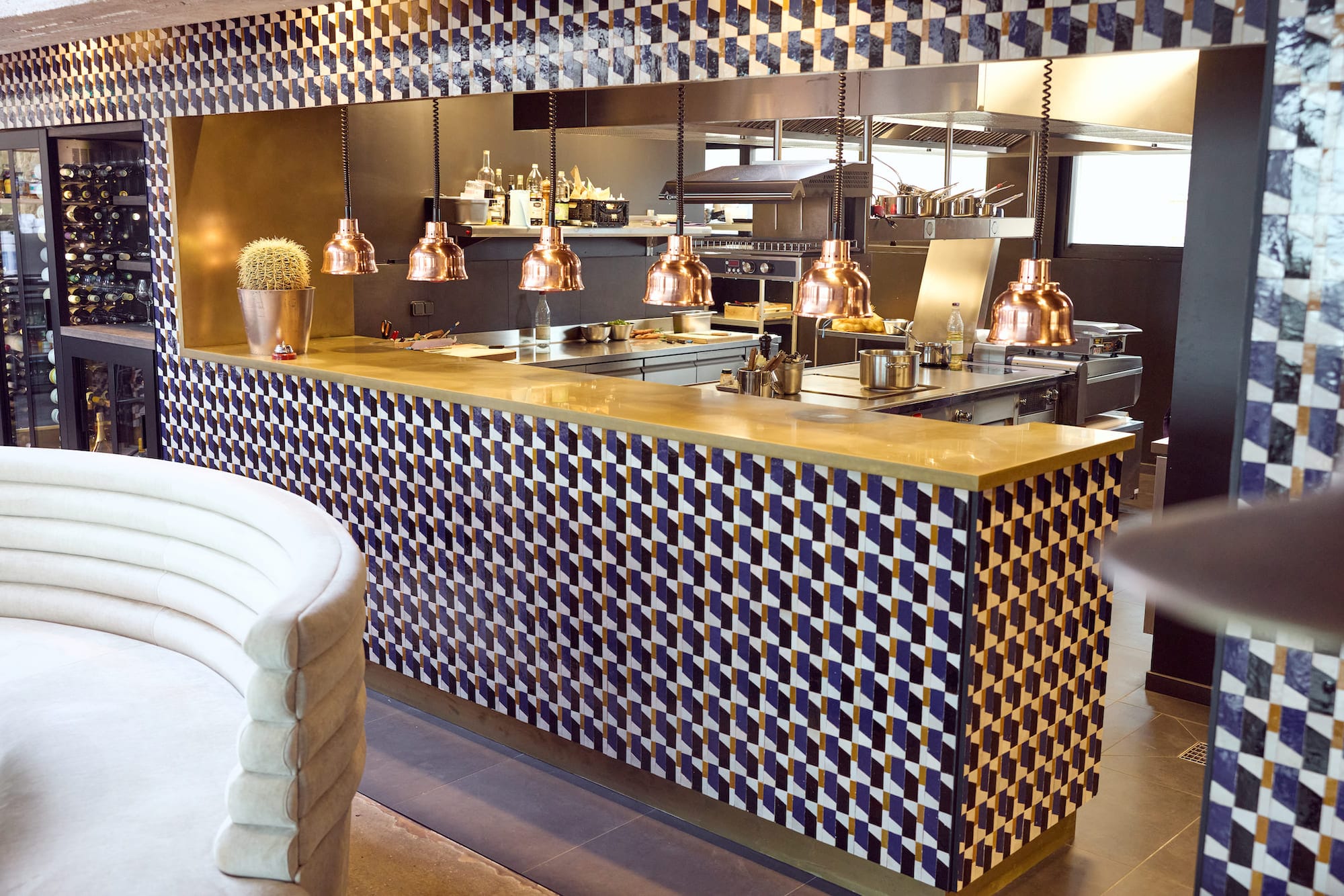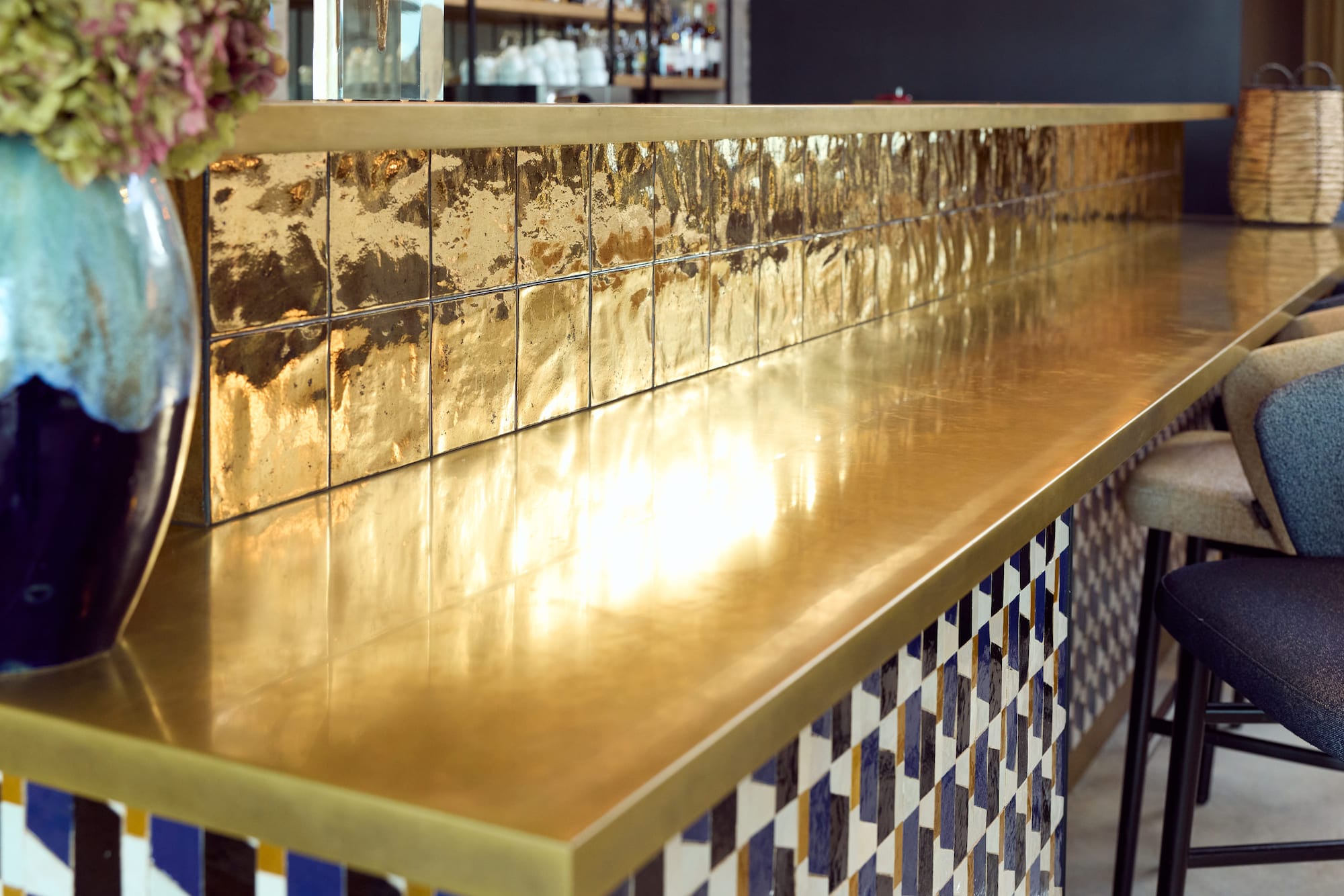 - Plans de travail en laiton réalisés sur mesure, conçus pour résister à un usage intensif en restauration tout en conservant une finition raffinée.